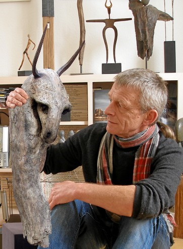 Traditioneller, aber nichtsdestotrotz mindestens genauso erfolgreich ist der Künstler mit seinen Holz-, Stein-, Metallskulpturen. Als verbindendes Element steht der Wille zu gestalten. In dem einen Fall sind es frei geschaffene Objekte, in dem anderen in der Natur vorgefundene Granitsteine oder Holzwurzeln, die er den ursprünglichen Formen gemäß, aber nach eigener Fantasie umformt. So entstehen Köpfe von Menschen und Tieren, Körper aus Stahl oder Holz, in denen sich Natur und Geist verbinden. Auch da ist nicht die Suche nach tieferem Sinn erkennbar, sondern die Lust am kreativen Gestalten, die Freude am Objekt. Ein sympathischer Zug.