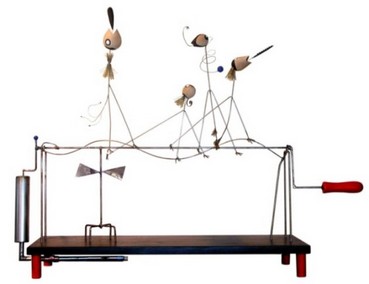 Natürlich, der 1952 in Eichelberg/Kreis Heilbronn geborene Gross, der als Elektroinstallateur seine Laufbahn begonnen hat, Heilerziehungspfleger wurde, dann Diplomsozialpädagoge, später Philosophie und Kunstgeschichte studierte und seit 14 Jahren als freischaffender Künstler lebt, hat noch mehr zu bieten. Es sind vor allem mobile Objekte, kinetische Kunst, die an den Schweizer Jean Tinguely erinnert, also Objekte, die nichts anderes bezwecken, als Bewegung und Geräusche zu produzieren. Doch diese Geräte sind bei Gross etwas dezenter, filigraner, handlicher. ja fast könnte man sagen spitzfindiger geraten als bei dem Schweizer Vorbild.